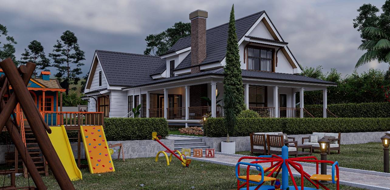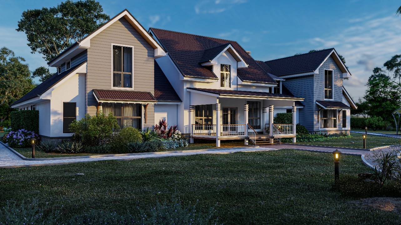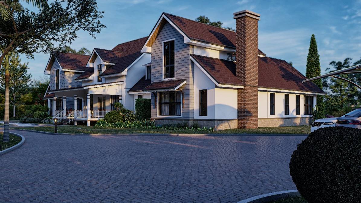 This 5-bedroom farmhouse in Eldoret, Kenya, showcases traditional elegance with its symmetrical facade and classic design. Inside, warm finishes and a cozy layout reflect the essence of farmhouse comfort.