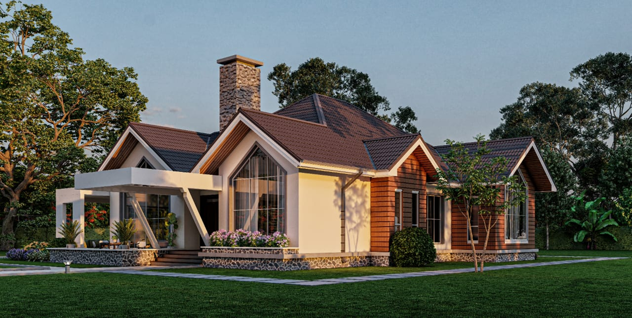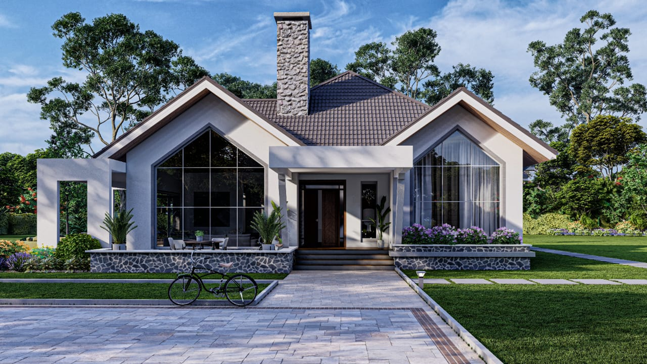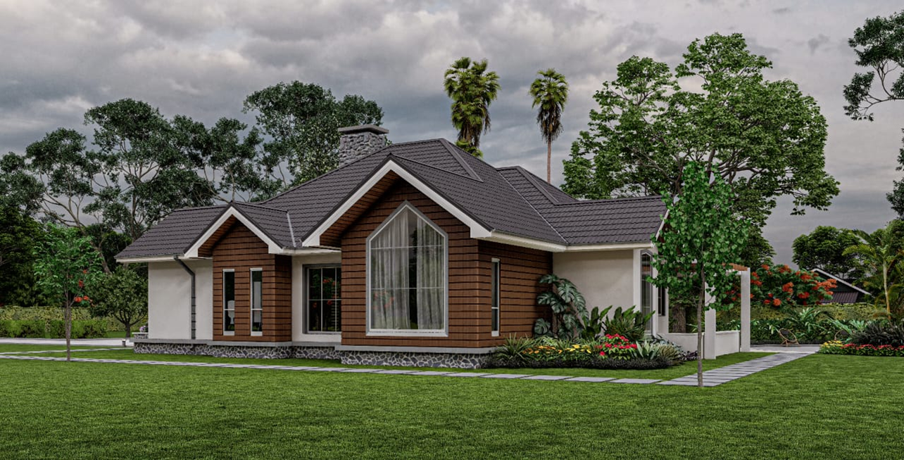 This is a modern 3-bedroom bungalow in Kisumu, Kenya. The home features large windows that flood the interiors with natural light, creating a bright and airy atmosphere. Warm natural finishes like stone and timber cladding add to its design.