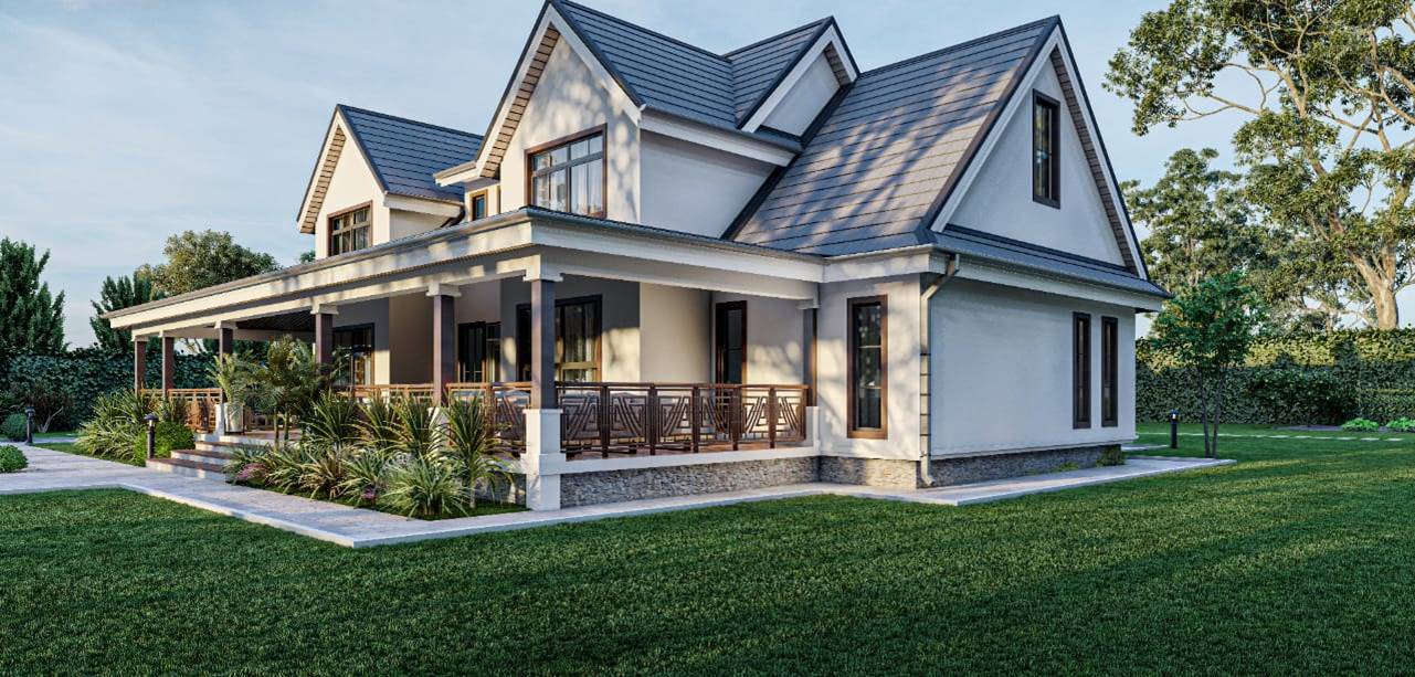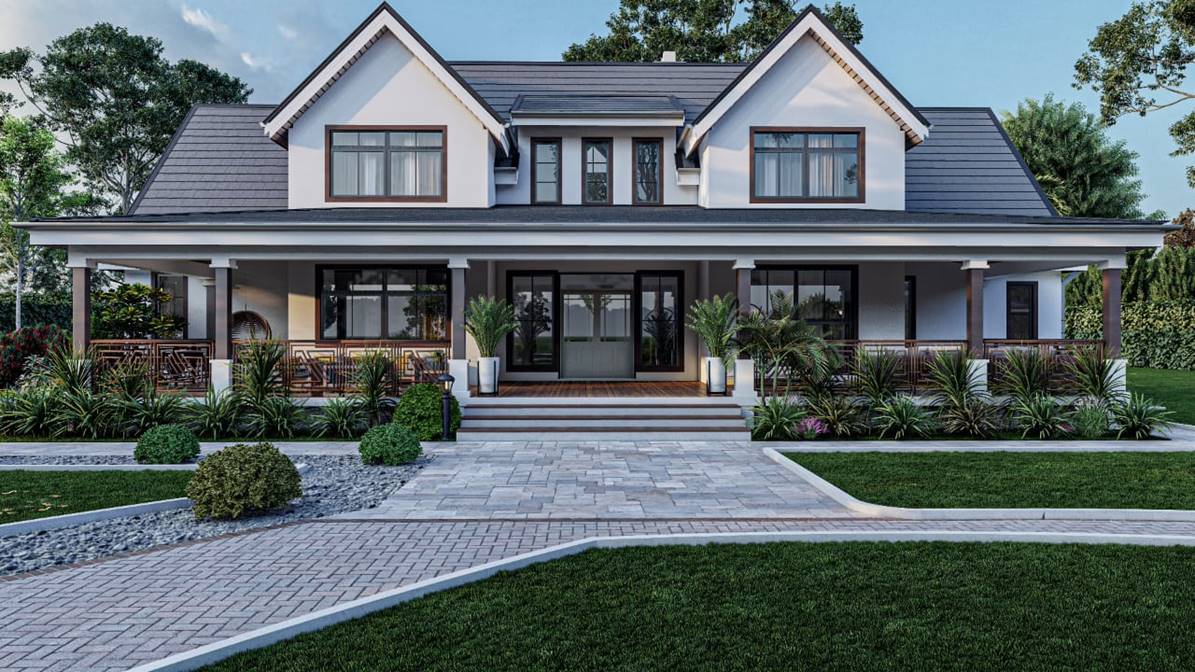This is a another take on the traditional farmhouse style of homes. Complete with a grand porch framed with stylish columns, gable windows, high cathedral ceilings and warm interior finishes, this home captures the true essence of farmhouse architecture.
